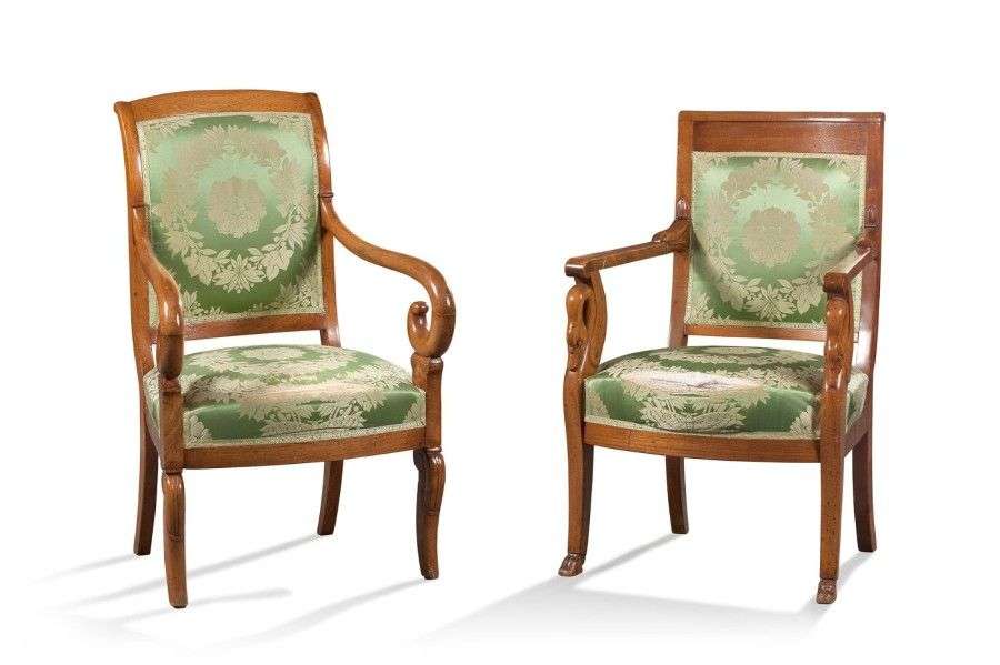 Deux fauteuils en noyer et acajou| l'un à accotoirs à crosses, l'autre à cols de cygne.