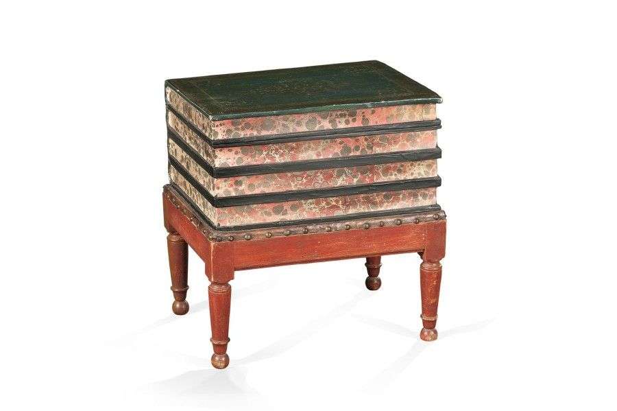 Tabouret de bibliothèque formant marchepied sous forme d'un empilement de volumes reliés et titrés «Voyages des Pays-Bas» disposés sur un piétement à pieds fuselés à bagues en bois teinté. Il ouvre par un couvercle découvrant un large casier.