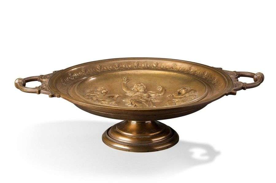 Tazza en bronze ciselé et patiné à décor en bas-relief d'une scène animée d'un couple de musiciens et de la muse de la musique| poignées ajourées à rinceaux. Base circulaire. Titrée: «Terpsichore».