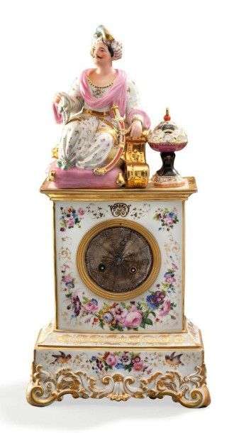Belle pendule en porcelaine blanche à décor polychrome| elle représente un jeune prince ottoman assis sur des coussins, à ses côtés, un brûle-parfum orné d'un croissant de lune| le cadran en métal guilloché et argenté est inscrit dans une borne à décor de rinceaux fleuris et cartouches animés d'oiseaux| la base à doucine et décor de coquille et feuillages en relief.
