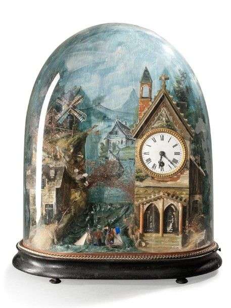Pendule à automate en bois, carton et papier, à décor peint au naturel représentant un estuaire dans lequel navigue un bateau| sur l'une des rives, une falaise surmontée d'un moulin, sur l'autre, une église recevant le cadran indiquant les heures en chiffres romains par tranches de cinq. Sous un globe peint en perspective. Fin du XIXème siècle (accidents au décor). H: 48 - L: 37 cm