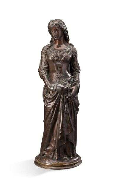 Jeune femme en bronze ciselé et patiné représentée en pied vêtue à la mode de la Renaissance et tenant dans la main droite un bouquet. Titré: Marguerite (Beaux-arts) et présentant un envoi: «Hommage du personnel de l'atelier des machines de Saintes 1894».