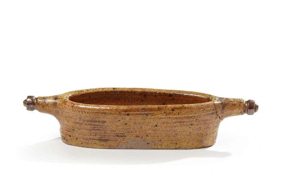 Terrine "pirogue", poignées latérales, émail marron Signée "BEYER et datée 98 L: 37 cm (accident sur une anse)