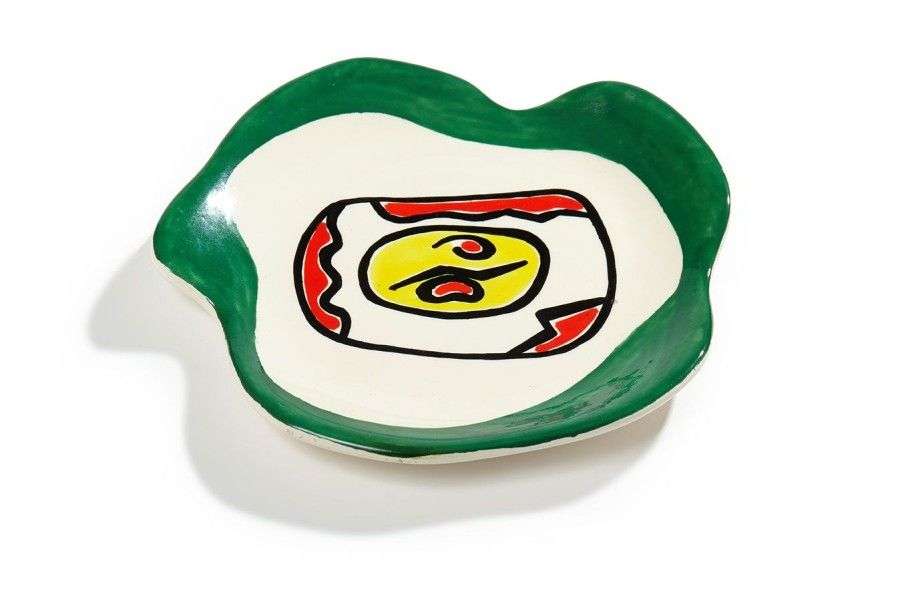 Assiette à bord contourné irrégulier à décor abstrait sur fond blanc Signée "R. BRICE BIOT-AM" circa 1960 D: 23 cm