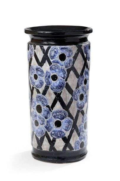 Grand vase rouleau en céramique émaillée bleue à décor de fleurettes sur fond guilloché Signé "Cazaux Biarritz" H: 47 cm
