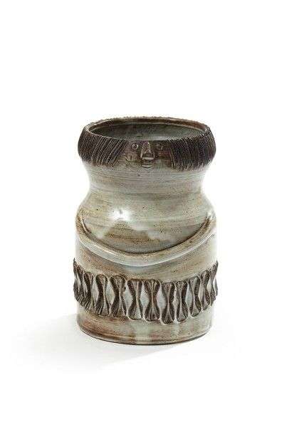 Vase antropomorphe à décors en creux et relief, émaillage blanc partiel Signé sous la base "L'atelier Dieulefit" H: 15 cm