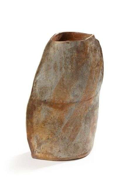 Grand vase de forme libre à décor d'émail blanc vaporeux sur fond brut Monogramme 1990 H: 43 cm