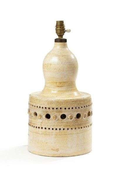 Pied de lampe de forme pansue se terminant en cylindre, en céramique émaillée et ajourée circa 1960 H (avec la douille): 42 cm