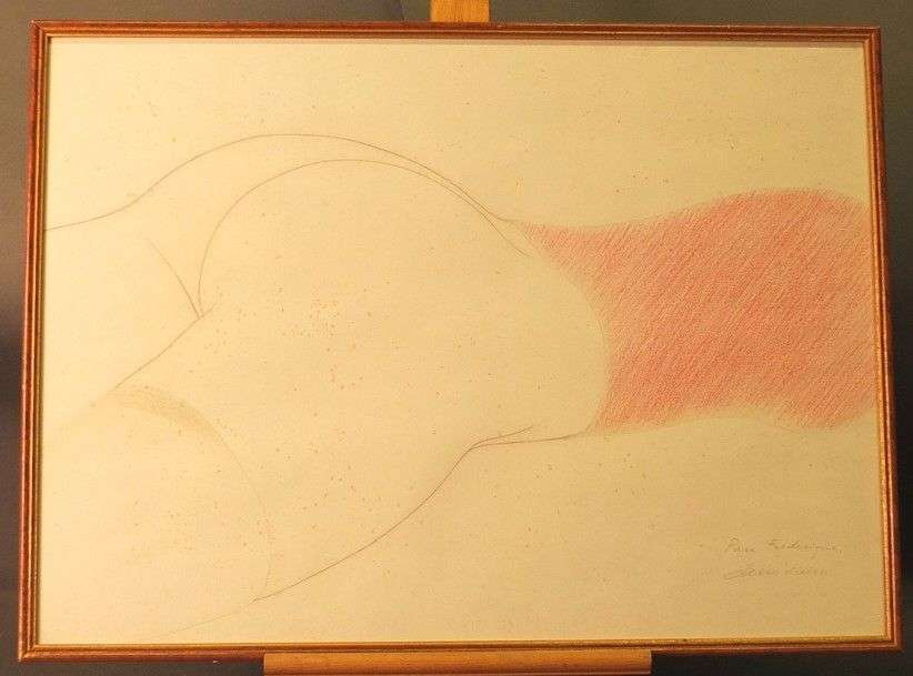 Crayons gris et couleur sur papier, signé en bas à droite avec envoi