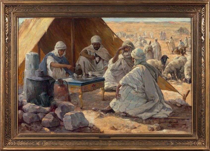 Notre regard est attiré par la disposition de la scène qui se déroule sur la gauche, la qualité des objets et des meubles, l'espace, les détails, la précision des traits... Nous sommes comme invités à partager ce moment paisible à l'ombre de cette tente. Sans cesse, notre regard revient vers cette partie principale, mettant ainsi en évidence le privilège qui nous est ainsi offert. Le décalage avec la scène qui apparait en second plan, sur la droite, est violent, par une lumière forte, une nette différence dans la taille des personnages, leur nombre important... le peintre laisse pressentir la chaleur accablante de ce milieu de journée.