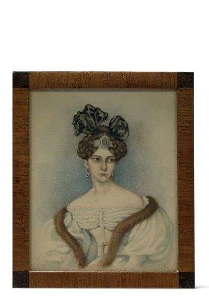 Portrait de femme en robe de voile blanc bordée de zibeline, sa coiffure ornée d'un bijou frontal et retenue par un ruban noué.