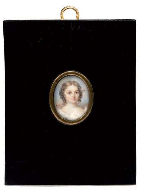 Portrait de Mademoiselle Adeline de MAGALLON (1818) en robe de voile blanc et coiffée de boucles.