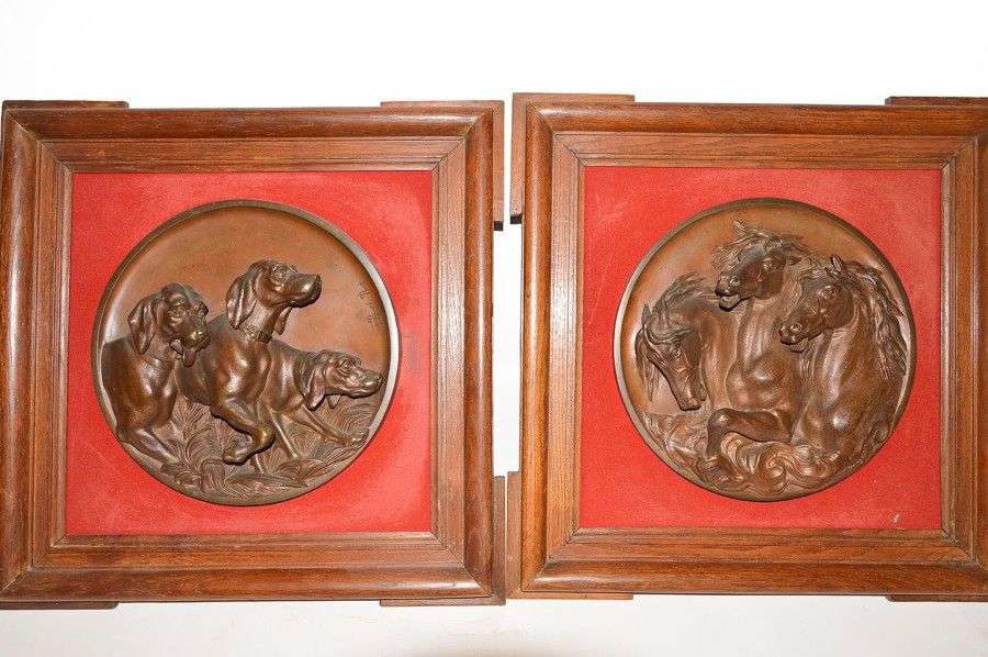 Paire de médaillons ronds, en bronze à patine médaille, signés sur le pourtour.