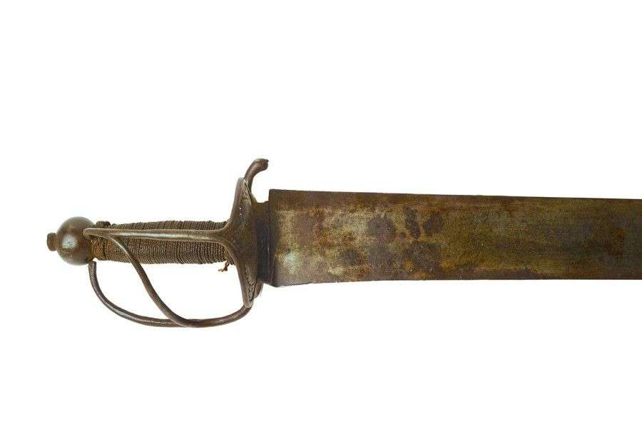 Monture en fer. Garde à quatre branches et poucier. Coquille bivalves repercée à décor de fleur de lys. Très forte lame à deux tranchants, avec restant de gravure au talon. EM