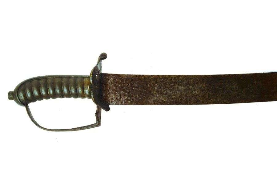 Monture en laiton. Poignée à godrons. Garde à une branche. Lame courbe, à dos plat avec restant de gravure. Dans l'état SF (accidents, piqûres)
