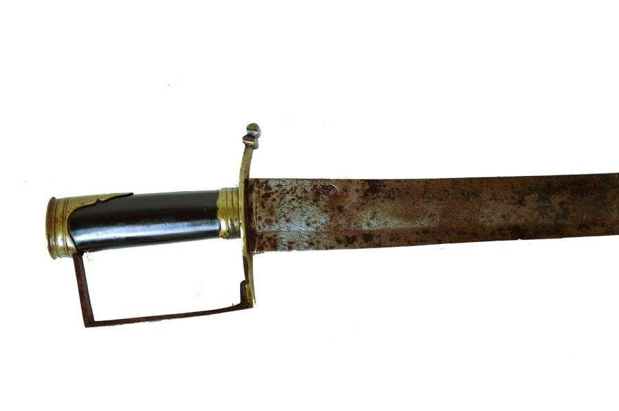 Monture en laiton. Calotte à courte queue. Branche de garde réparée, en fer rivetée. Lame courbe, à dos plat, pans creux, gravée au talon «Lieutenant des Brigade des Baronnes». EM SF Époque Louis XVI