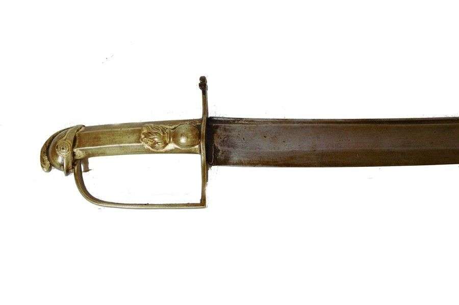 Monture en laiton. Poignée décorée d'une grenade, surmontée d'un casque empanaché avec cocarde. Garde à une branche. Lame courbe, à dos plat, pans creux et gouttière. EM SF