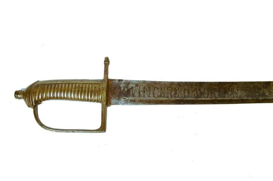 Monture en laiton. Garde à une branche marquée «Varuter à Paris». Lame courbe, à dos plat marquée «M Barrifoni» et pans creux, gravée sur une face «Vincere O Morire», sur l'autre face «Viva la Republica italiana». EM SF