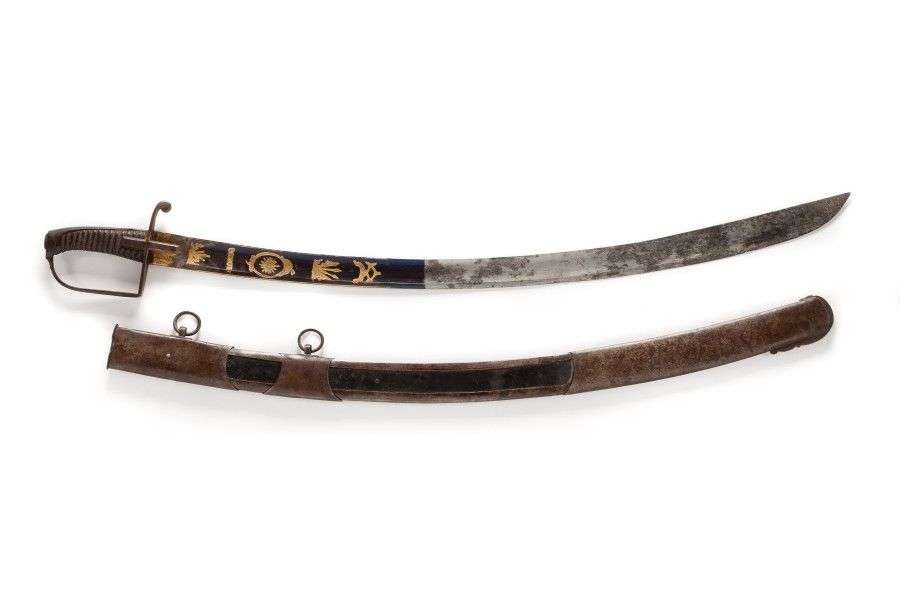 Monture en fer. Calotte à longue queue. Garde à une branche, à oreillons en baguette. Forte lame courbe, à dos plat, contre-tranchant et pans creux, gravée, dorée et bleuie au tiers d'attributs militaires, Hussard chargeant et d'écritures.