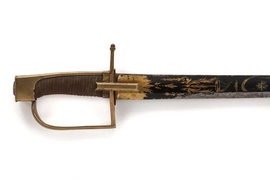 Calotte à longue queue. Garde à une branche et oreillons en baguette dissymétriques. Lame courbe, à dos plat, contre-tranchant et pans creux, laquée au tiers d'attributs révolutionnaires.