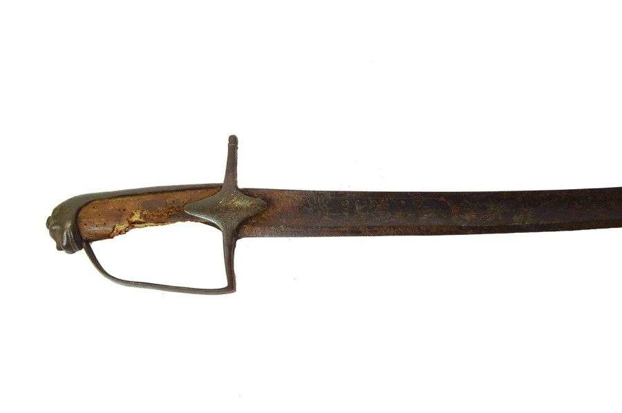 Garde à une branche à oreillons losangiques. Lame courbe, à pans creux gravée. Dans l'état. Fin XVIIIè siècle (accidents, manques, piqûres)