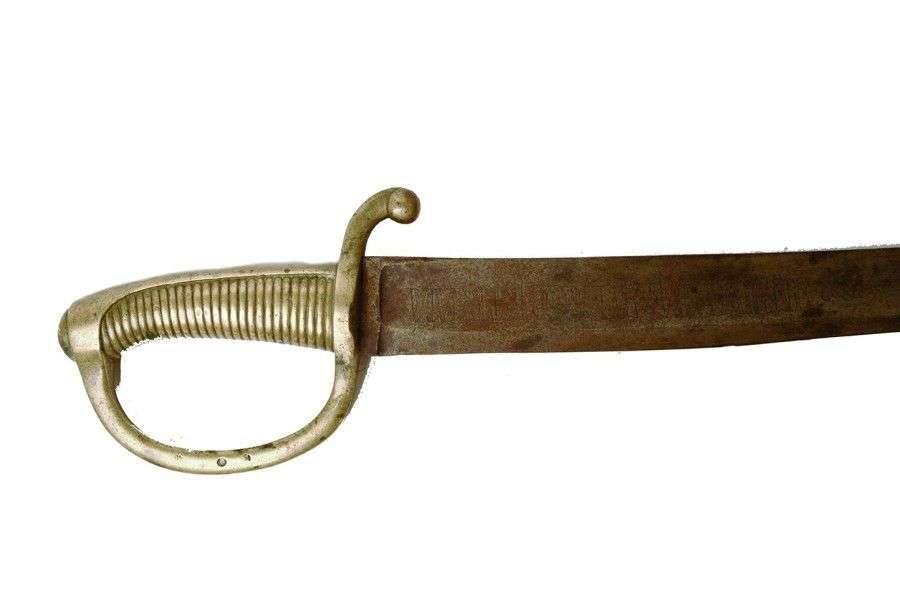 Monture en laiton. Garde à une branche. Lame courbe, à dos plat et pans creux, marquée sur une face «Vive le Roy de Sardaigne». EM SF