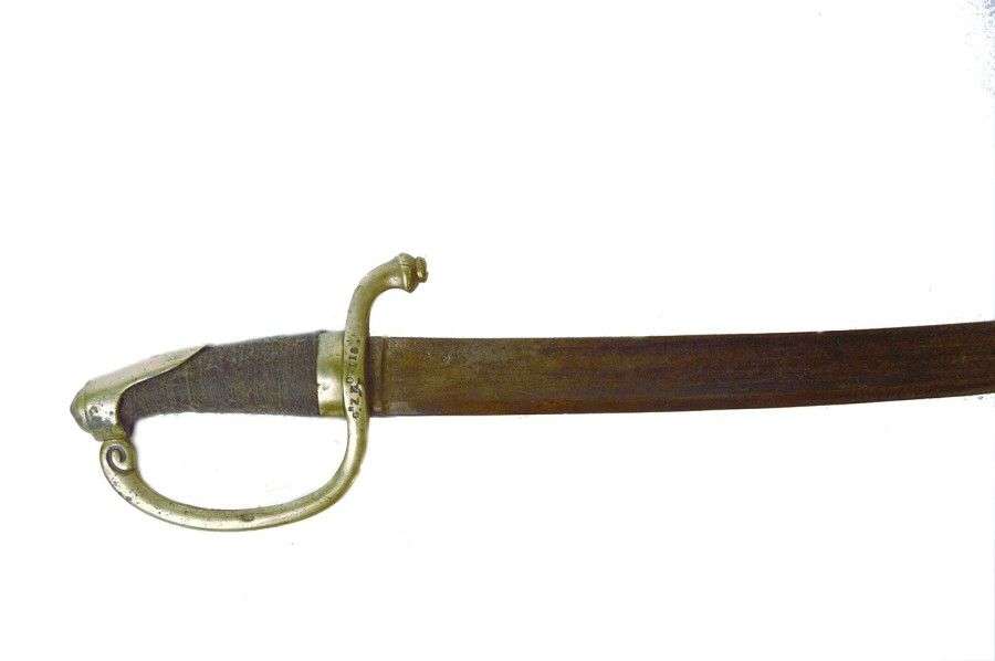 Monture en laiton. Calotte à courte queue. Garde à une branche. Lame courbe, à dos plat avec marquage et pans creux, poinçonnée au talon. EM SF