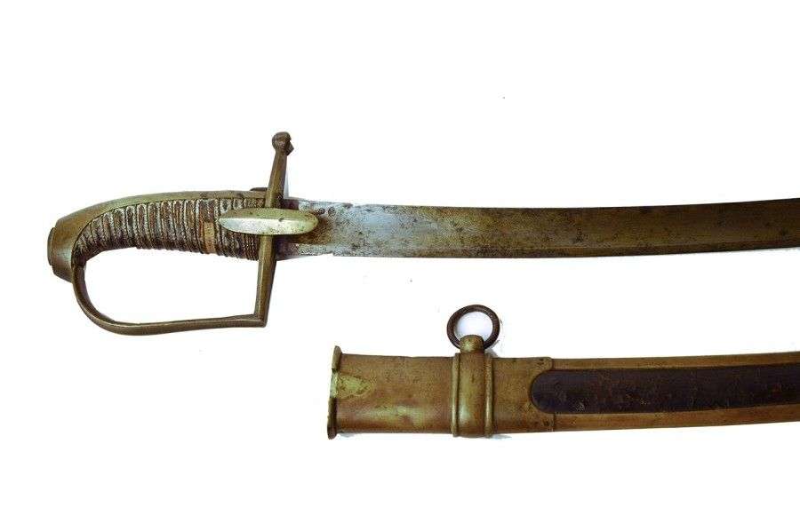 Fourreau recouvert de cuir, à deux garnitures et deux atèles en laiton. Anneaux et dard en fer. EM (usures, lame piquée)