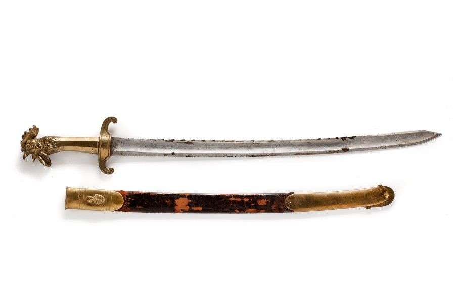 Monture en laiton. Poignée à pans, surmontée d'une tête de coq. Garde à deux quillons enroulés. Lame courbe, à dos scie et pans creux.