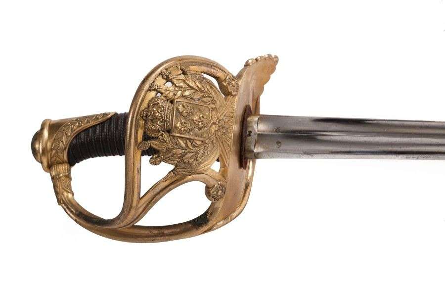 Monture en laiton ciselé, doré. Calotte à courte queue. Garde à une branche principale, deux secondaires et coquille aux Armes de France entourée d'un faisceau de drapeaux. Lame droite, à dos rond marquée «Manufre Rale du Klingenthal juin 1820/» et deux pans creux, poinçonnée au talon.