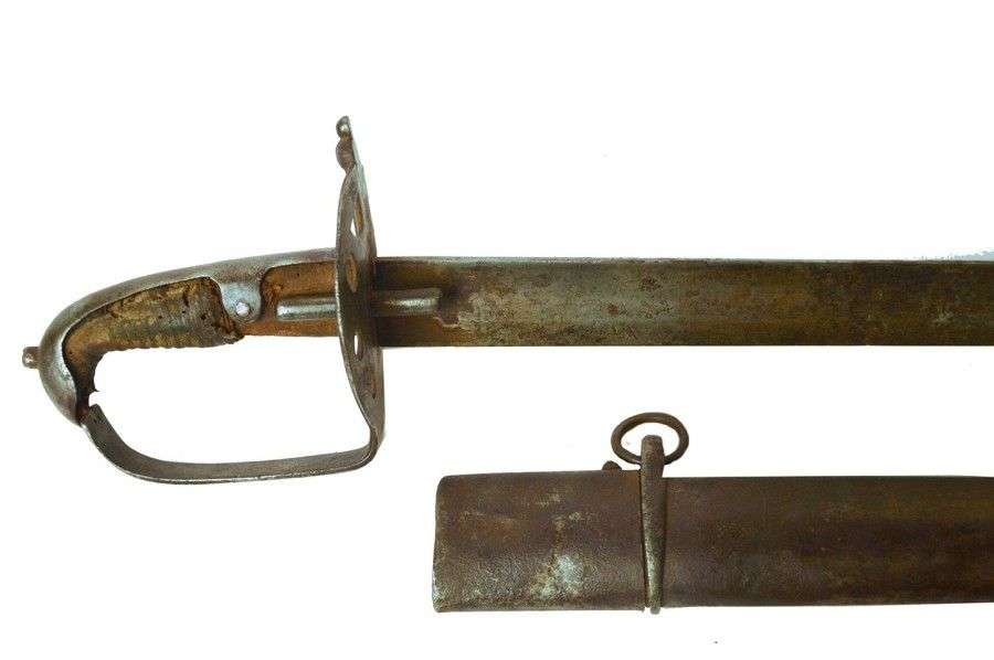 Monture en fer. Calotte à longue queue.Garde à une branche, à coquille ronde ajourée et oreillons. Lame droite, à dos plat et pans creux.