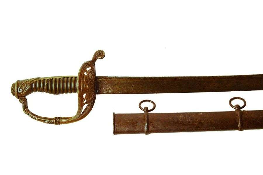 Calotte à longue queue. Garde à une branche à coquille ajourée, à décor de feuilles de chênes et lauriers, sur faisceau de drapeaux. Lame courbe, à dos baguette.