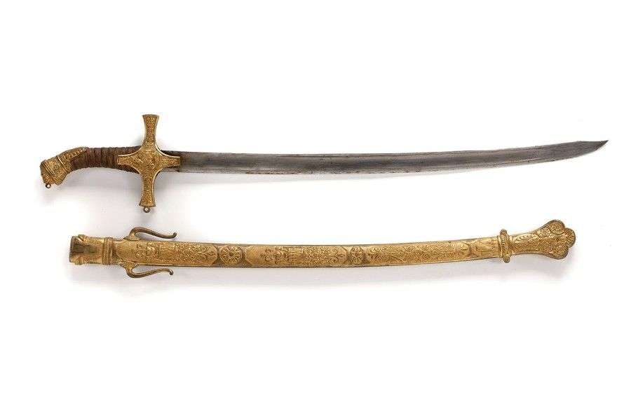 Monture en laiton ciselé, doré. Calotte à courte queue surmontée d'un mufle de lion. Garde à deux quillons s'évasant, à noeud de corps gravé sur une face du coq. Lame courbe, à dos plat, pans creux et gouttière.
