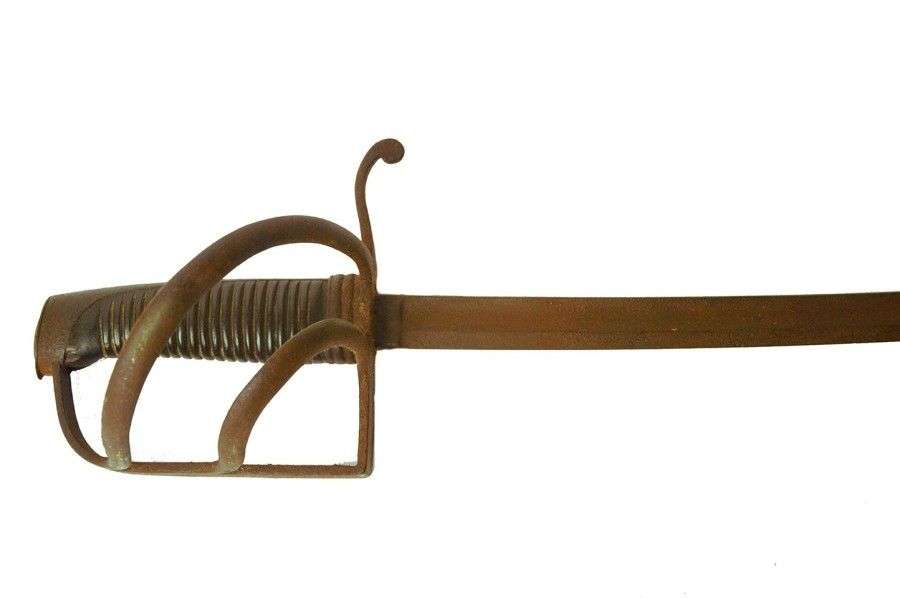 Monture en fer. Calotte à longue queue. Garde à trois branches. Lame courbe, à dos plat et pans creux. EM SF