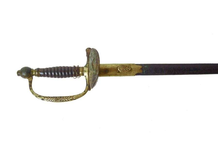 Monture en laiton. Garde à une branche. Clavier au casque et haches croisées. Lame à deux tranchants.