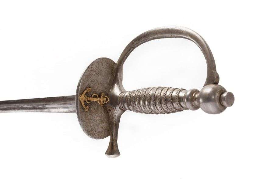 Monture en métal blanc. Garde à une branche. Clavier à motif rapporté de l'ancre. Lame triangulaire.