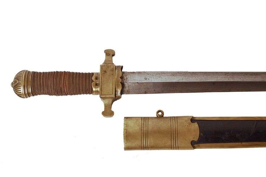 Monture en laiton. Garde à deux quillons. Lame droite, à deux tranchants à arête médiane.