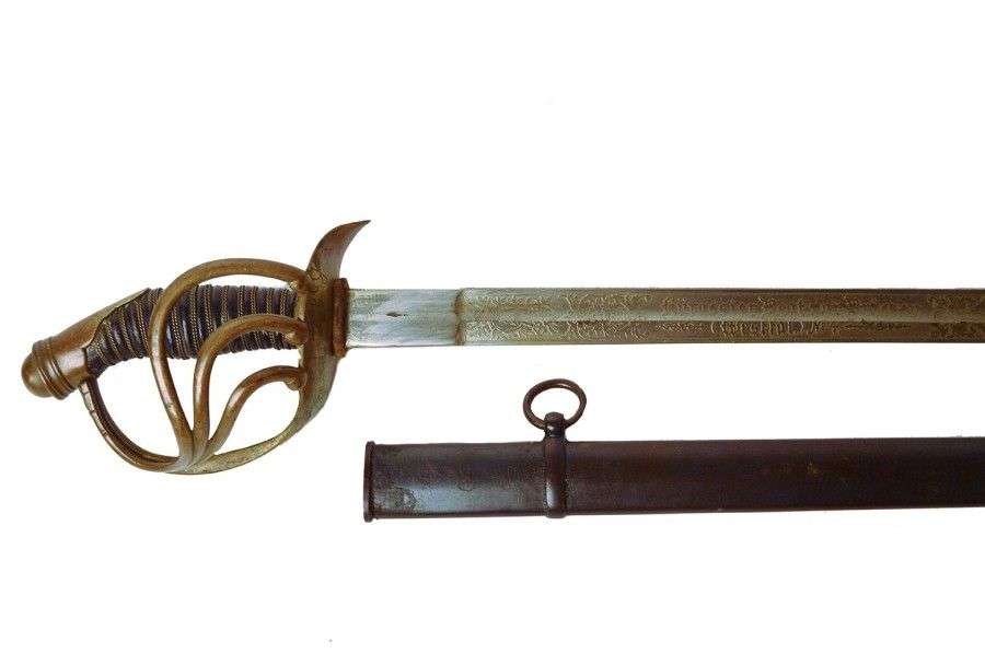 Monture en laiton cuivré. Calotte à courte queue. Garde à quatre branches, dont trois boulées, marqué «Radettlachet». Lame droite, à dos rond et pans creux, gravée «Kürassier Regt. von Driesen (Westfäl.) N°4» et devise patriotique.