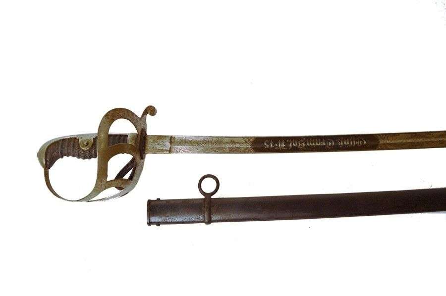 Monture en métal nickelé. Garde à quatre branches. Lame courbe, à dos rond et pans creux, gravée «Elsäss Train Bat. N°15» et devise patriotique.