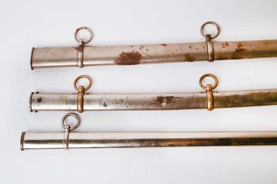 Lot de 3 fourreaux de sabre, en métal nickelé: deux à deux bracelets et un à un bracelet. Dans l'état