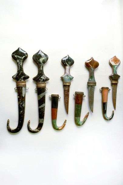 Lot de 5 poignards orientaux. Poignées et fourreaux en pierres dures