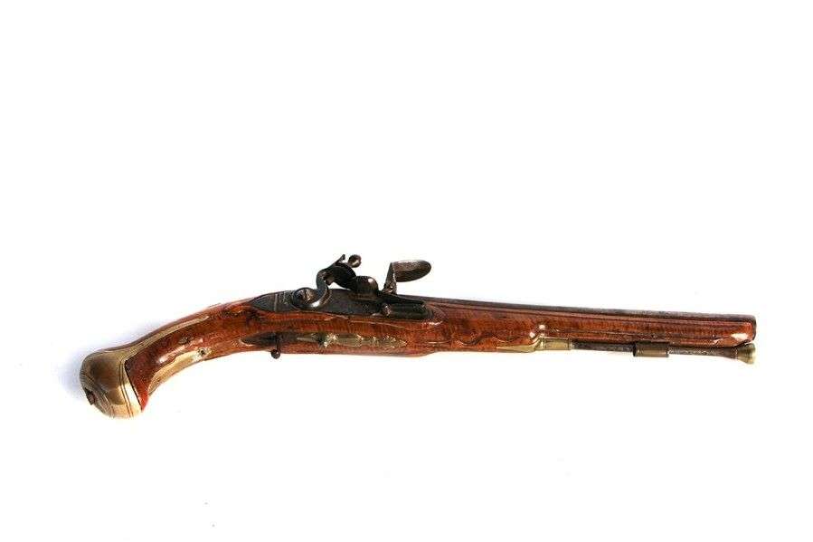 Pistolet d'arçon, à silex. Canon rond, à méplats sur le dessus et au tonnerre. Platine et chien col de cygne à corps plat. Garnitures en laiton. Crosse en noyer. Avec une baguette en fer à embout en laiton. EM vers 1740 (accidents, manques)