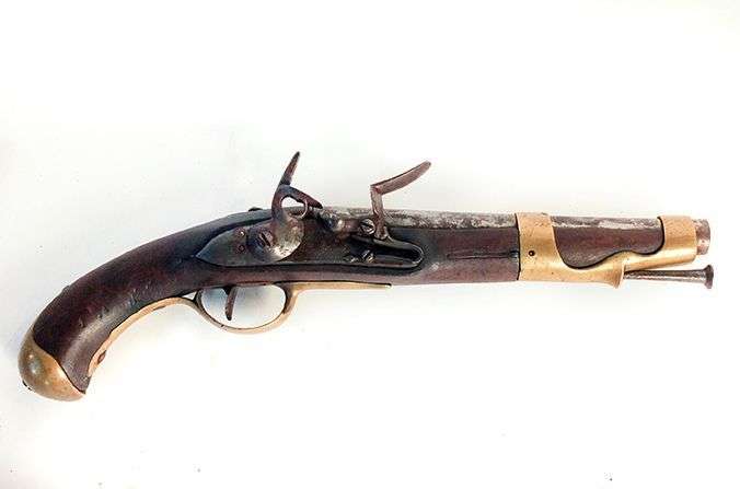 Pistolet d'arçon, modèle 1763-66, fabrication de 1775. Canon rond, à méplats au tonnerre daté 75. Platine marquée «Manufacture de St Étienne», chien à corps rond. Garnitures en laiton. Crosse en noyer avec marquage. Baguette en fer. EM (piqûres, usures, manque la mâchoire supérieure et la vis de chien)
