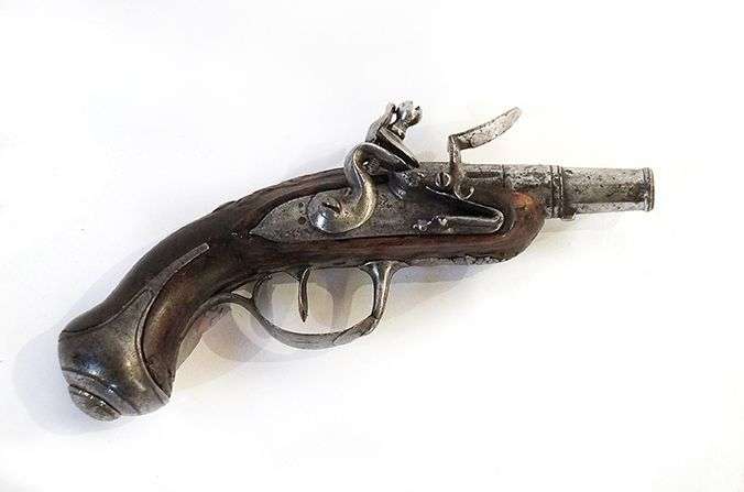 Petit pistolet de voyage, à silex, à balle forcée. Canon rond, à pans au t