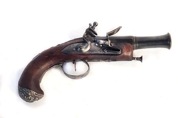 Pistolet tromblon, à silex. Canon rond évasé vers la bouche, à méplats au