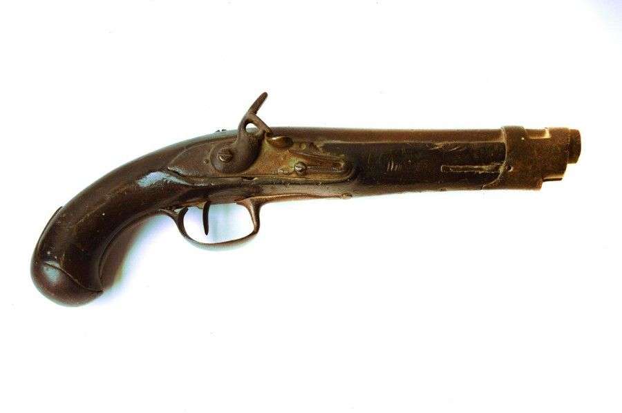 Pistolet de demi-arçon, à silex. Canon rond, à méplats au tonnerre. Garnit