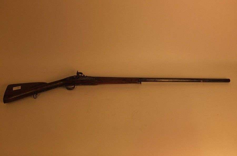 Fusil de chasse, à silex transformé à percussion. Canon rond. Platine à corps plat. Crosse en noyer. Dans l'état (composite)