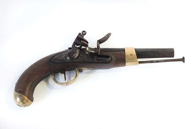 Pistolet d'arçon, modèle An XIII. Canon rond, à pans au tonnerre daté 1813. Platine marquée «Manuf Impe de Charleville». Garnitures en laiton poinçonné. Crosse en noyer avec cachet. Baguette en fer. EM (piqûres, usures, trous pour un anneau dans la crosse)