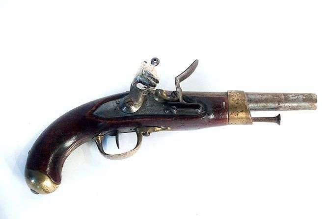Pistolet d'arçon, modèle An XIII. Canon rond, à pans au tonnerre daté 1814. Platine marquée «Manuf Imp de St Étienne». Garnitures en laiton poinçonné. Crosse en noyer avec marquage. Baguette en fer. ABE (piqûres, accident à la crête de chien)