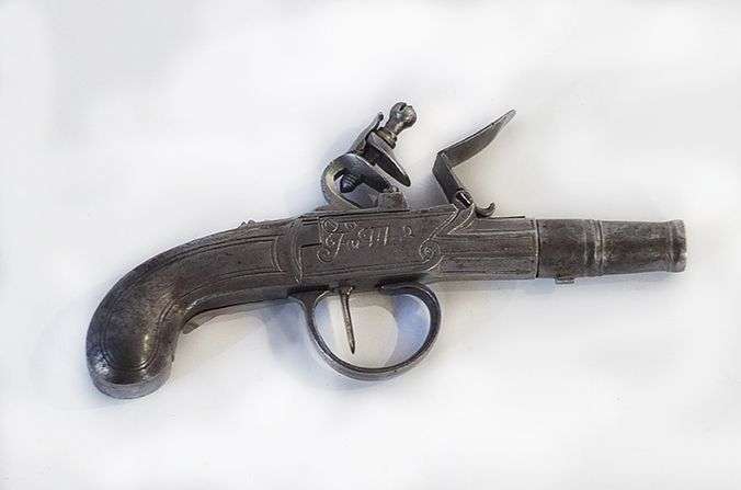 Pistolet à coffre, à silex, à balle forcée. Canon rond. Coffre signé postérieurement «Far Me2 London».
